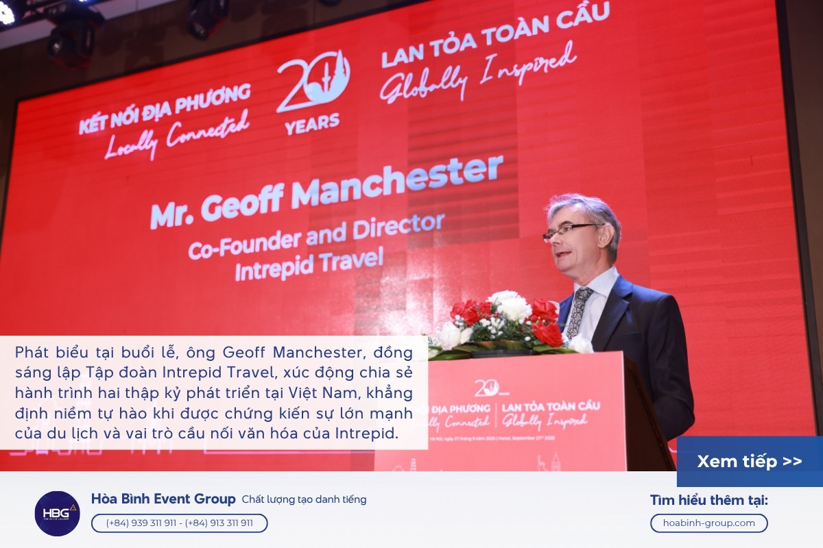 “Việt Nam luôn là điểm đến quan trọng…” – Đó là lời khẳng định của ông Geoff Manchester – đồng sáng lập Tập đoàn Intrepid Travel tại Lễ kỷ niệm 20 năm thành lập Intrepid Việt Nam, diễn ra tối ngày 27/9 vừa qua tại Hà Nội.